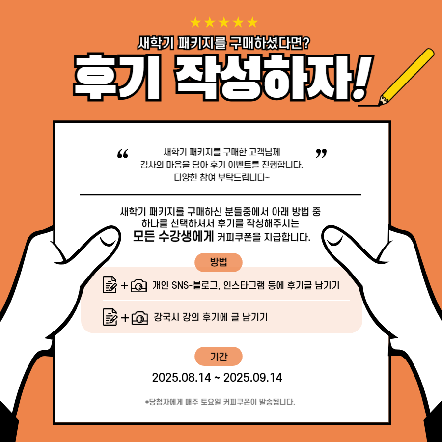 이벤트 홈/이벤트 [후기 이벤트] 새학기 패키지를 구매하셨다면?? 조회 : 400 등록일 : 2025-08-14 07:06 작성자 : kangguksi 좋아요 0 싫어요 0 인쇄 전체 0 추천순 작성순 최신순 작성자 비밀번호 사진 첨부파일 목록보기 답글쓰기 글수정 글삭제